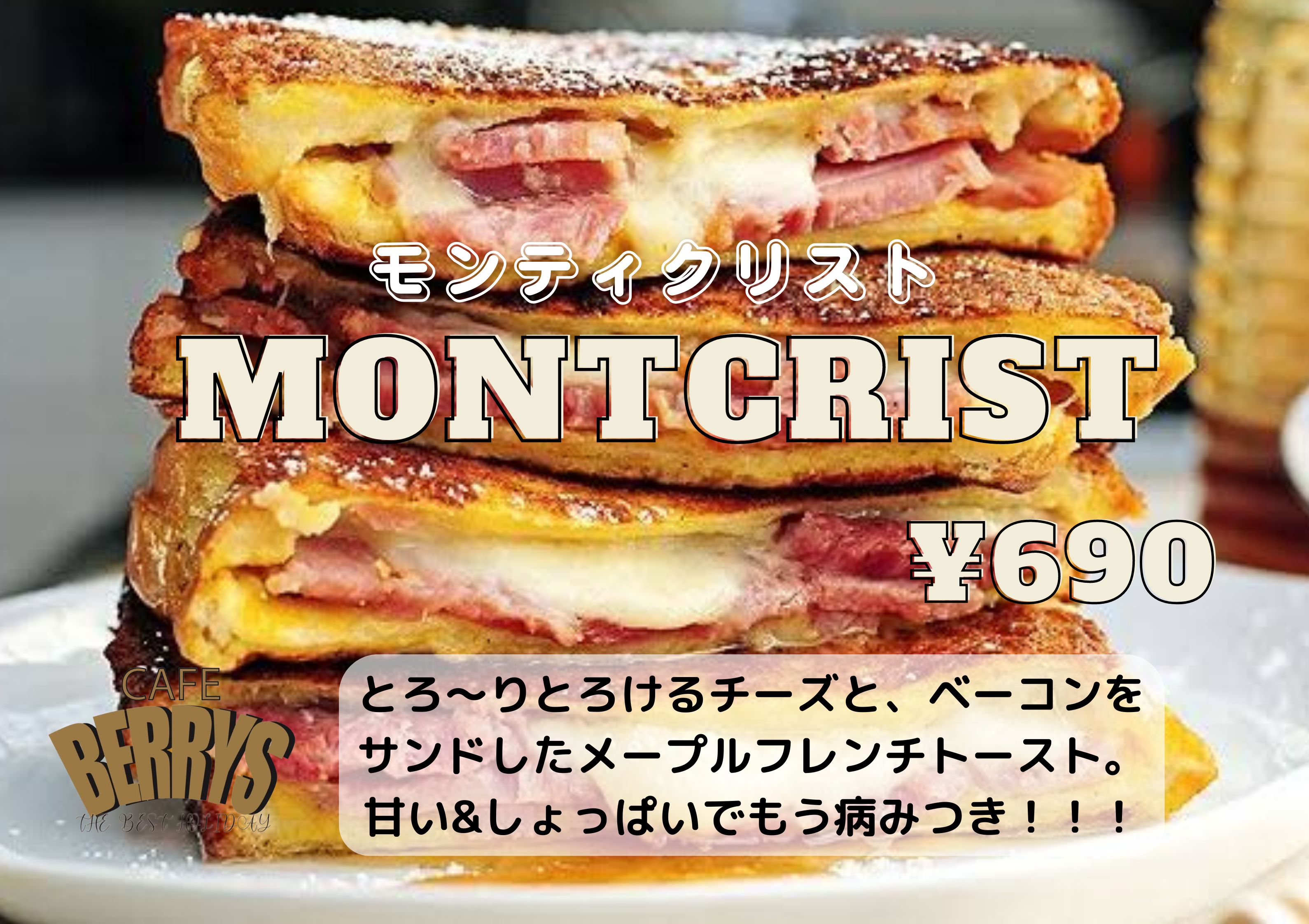 ベーコンと、とろーりチーズを地元では有名なパンつくしの『病みつきメープルラウンド』で作るフレンチトーストでサンドした《モンティクリスト》が絶品。