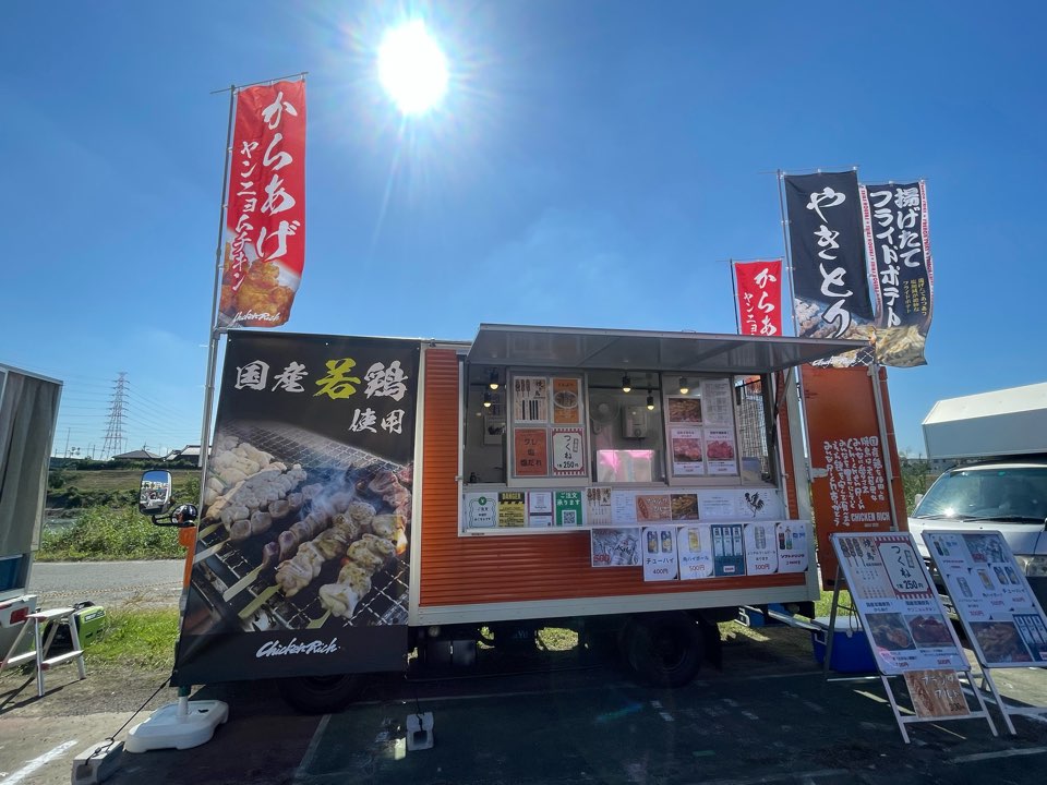 焼き鳥、唐揚げ、ヤンニョムチキン、手羽中唐揚げ、丼物、フライドポテト、フランクフルト、ソフトドリンク、アルコール