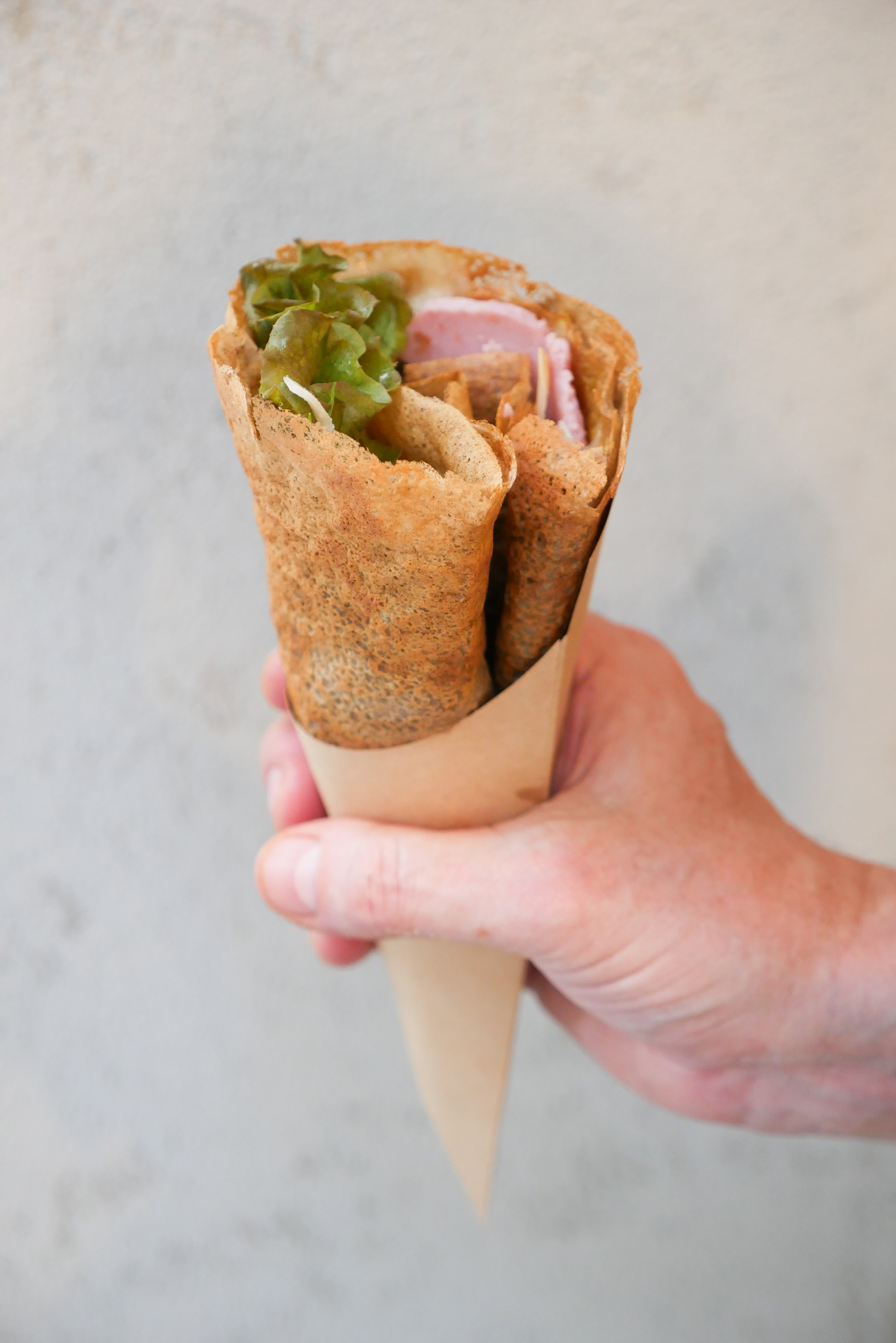 そば粉100%で作るガレット。具材はハム、チーズ、野菜を合わせたものです。イメージとしてはクレープのように手で持って食べられるグルテンフリーな食事系メニューとなっています。